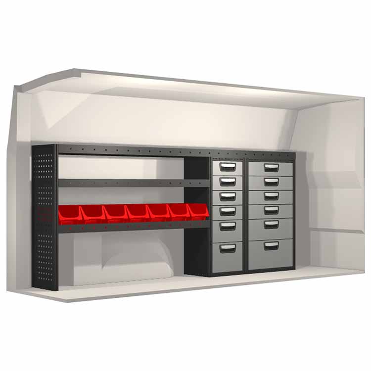 Dieses Einrichtungssystem wurde entworfen, um optimale Passgenauigkeit und bestmögliche Funktionalität und Sicherheit zu gewährleisten. Es ist für den professionellen Gebrauch entwickelt worden, ist flexibel und zur Anwendung in verschiedenen Geschäftsbereichen bestimmt. Universal- und Bodenwinkel sind enthalten.