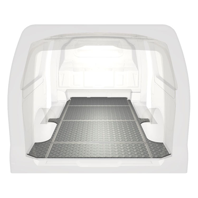 Leichte und robuste Fahrzeugböden mit Querschienen für einen Mercedes Vito werden mit einem rutschfesten Trittblech aus Aluminium und Schienen (längs und quer) für eine schnelle und sichere Montage von Regalsystemen und anderem Zubehör geliefert.