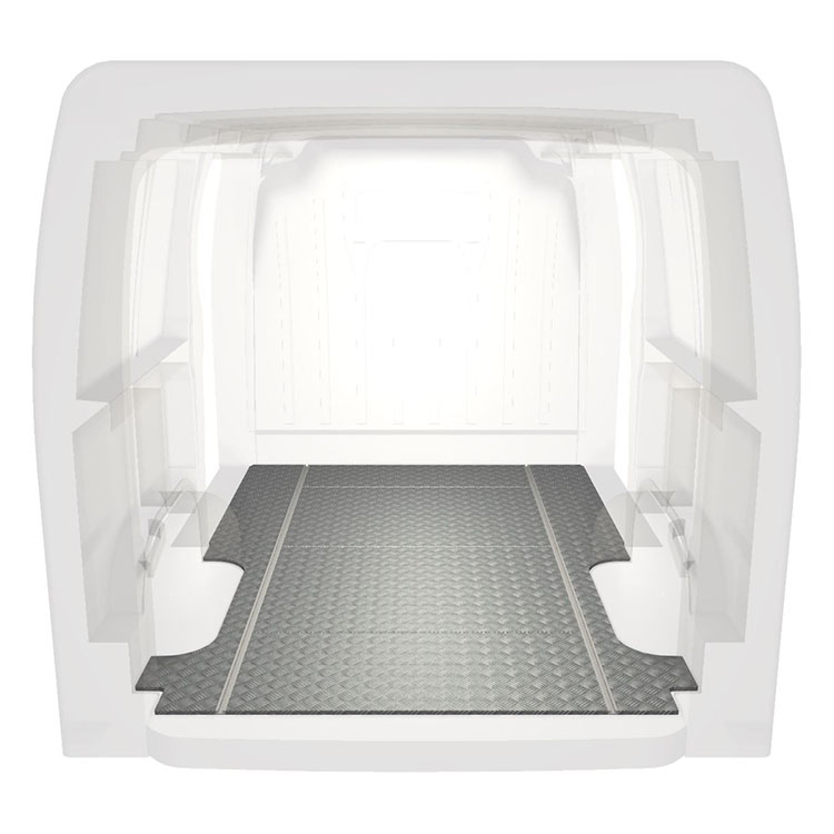 Leichte und robuste Standard-Fahrzeugböden für einen Renault Master / Opel Movano / Nissan NV400 werden mit einem rutschfesten Trittblech aus Aluminium und Schienen (längs) für eine schnelle und sichere Montage von Regalsystemen und anderem Zubehör geliefert.
