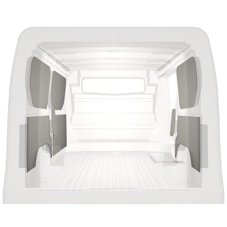 Leichte Innenverkleidung für die Innenwände eines Renault Trafic / Opel Vivaro / Fiat Talento / Nissan NV300 mit Seitentür rechts. Die Verkleidungen schaffen ein helles und angenehmes Arbeitsumfeld und sind leicht zu reinigen.