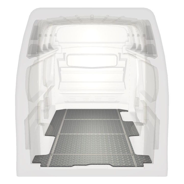 Leichte und robuste Fahrzeugböden mit Querschienen für einen Renault Trafic / Opel Vivaro / Fiat Talento / Nissan NV300 werden mit einem rutschfesten Trittblech aus Aluminium und Schienen (längs und quer) für eine schnelle und sichere Montage von Regalsystemen und anderem Zubehör geliefert.