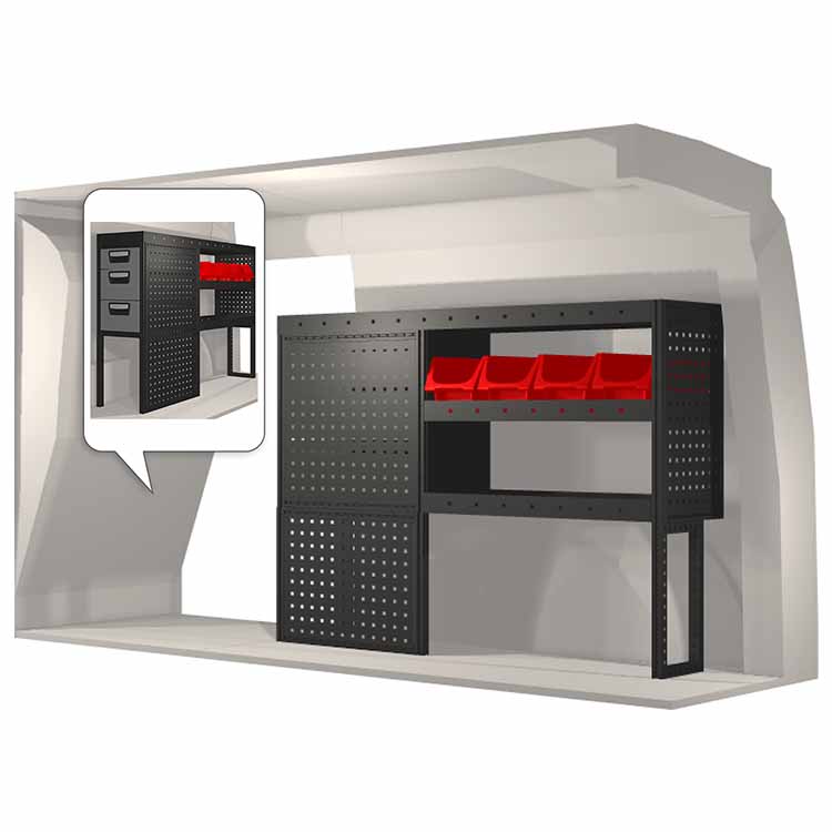 Dieses Einrichtungssystem wurde entworfen, um optimale Passgenauigkeit und bestmögliche Funktionalität und Sicherheit zu gewährleisten. Es ist für den professionellen Gebrauch entwickelt worden, ist flexibel und zur Anwendung in verschiedenen Geschäftsbereichen bestimmt. Universal- und Bodenwinkel sind enthalten.