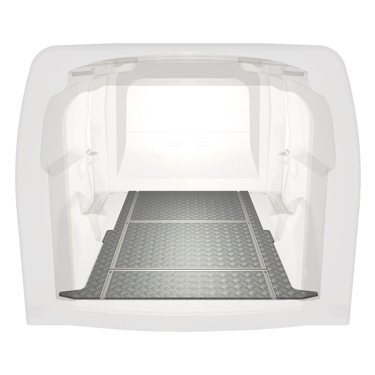 Leichte und robuste Fahrzeugböden mit Querschienen für einen Opel Combo / Fiat Doblò werden mit einem rutschfesten Trittblech aus Aluminium und Schienen (längs und quer) für eine schnelle und sichere Montage von Regalsystemen und anderem Zubehör geliefert.