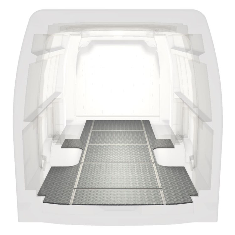 Leichte und robuste Fahrzeugböden mit Querschienen für einen Renault Master / Opel Movano / Nissan NV400 werden mit einem rutschfesten Trittblech aus Aluminium und Schienen (längs und quer) für eine schnelle und sichere Montage von Regalsystemen und anderem Zubehör geliefert.