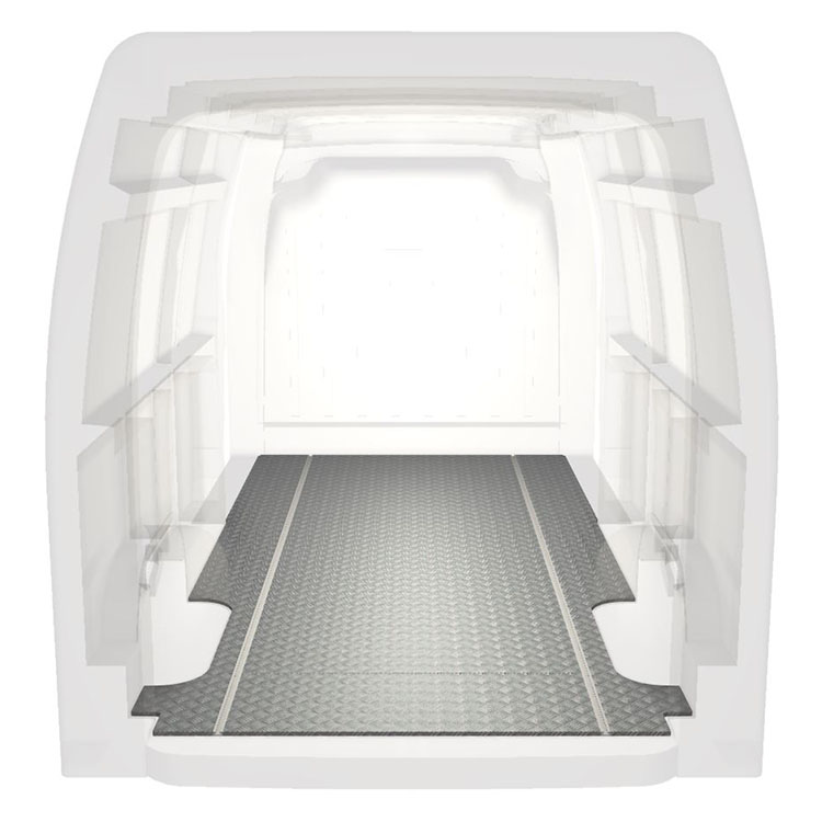 Leichte und robuste Standard-Fahrzeugböden für einen Renault Master / Opel Movano / Nissan NV400 werden mit einem rutschfesten Trittblech aus Aluminium und Schienen (längs) für eine schnelle und sichere Montage von Regalsystemen und anderem Zubehör geliefert.