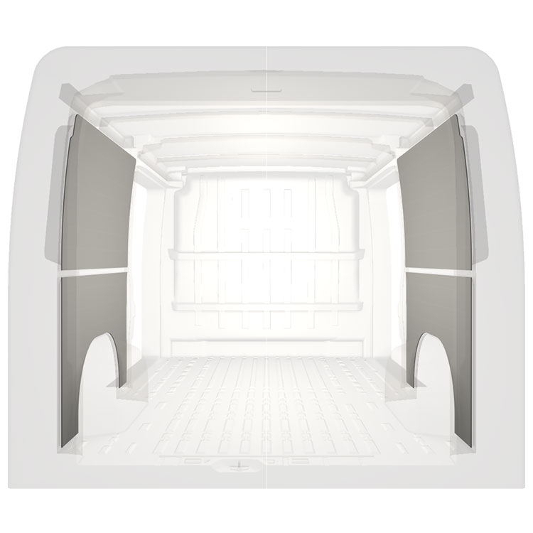 Leichte, zugeschnittene Verkleidung für die Innenwände eines Citroën Jumper / Peugeot Boxer / Fiat Ducato mit beidseitigen Seitentüren. Die Verkleidungen schaffen ein helles und angenehmes Arbeitsumfeld und sind leicht zu reinigen.