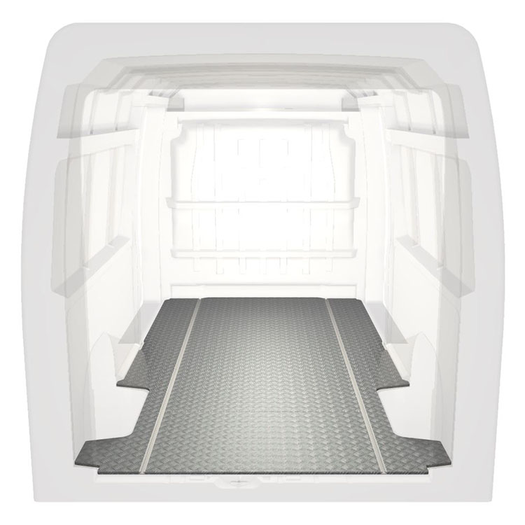 Leichte und robuste Standard-Fahrzeugböden für einen Citroën Jumper / Peugeot Boxer / Fiat Ducato werden mit einem rutschfesten Trittblech aus Aluminium und Schienen (längs) für eine schnelle und sichere Montage von Regalsystemen und anderem Zubehör geliefert.