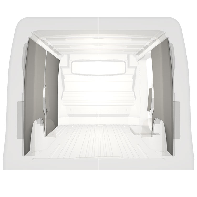 Leichte Vollverkleidung für die Innenwände eines Renault Trafic / Opel Vivaro / Fiat Talento / Nissan NV300 mit Seitentür rechts.Die Verkleidungen schaffen ein helles und angenehmes Arbeitsumfeld und sind leicht zu reinigen.