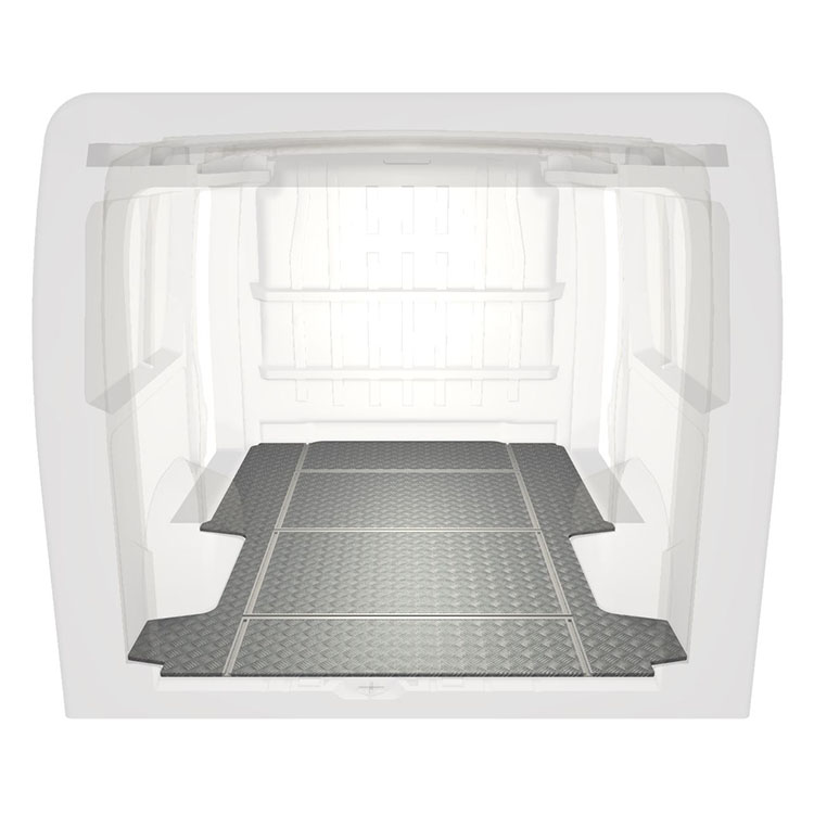 Leichte und robuste Fahrzeugböden mit Querschienen für einen Citroën Jumper / Peugeot Boxer / Fiat Ducato werden mit einem rutschfesten Trittblech aus Aluminium und Schienen (längs und quer) für eine schnelle und sichere Montage von Regalsystemen und anderem Zubehör geliefert.