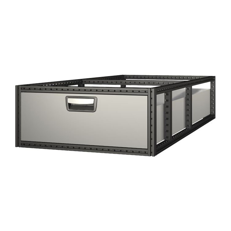 Die extralangen Schubladenmodule haben einen Rahmen aus ultrahochfestem Stahl und Schubladen aus Aluminium. Die Schubladen sind serienmäßig mit Kugellagern ausgestattet. Die Mischung aus festen und flexiblen Lagern macht sie sowohl stabil als auch einfach zu bedienen.