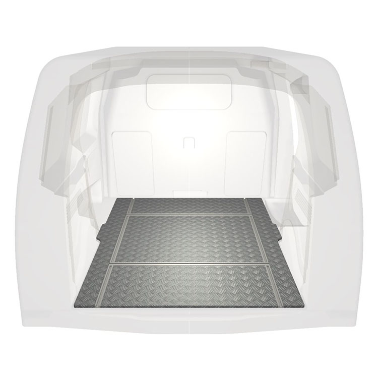 Leichte und robuste Fahrzeugböden mit Querschienen für einen Berlingo/Partner/Combo 19- werden mit einem rutschfesten Trittblech aus Aluminium und Schienen (längs und quer) für eine schnelle und sichere Montage von Regalsystemen und anderem Zubehör geliefert.