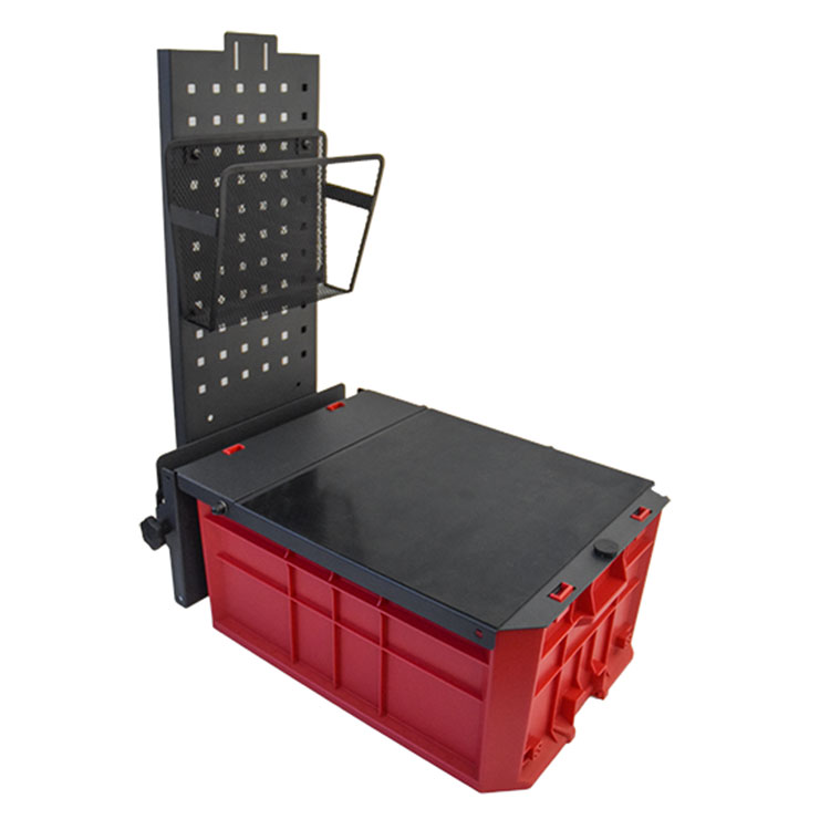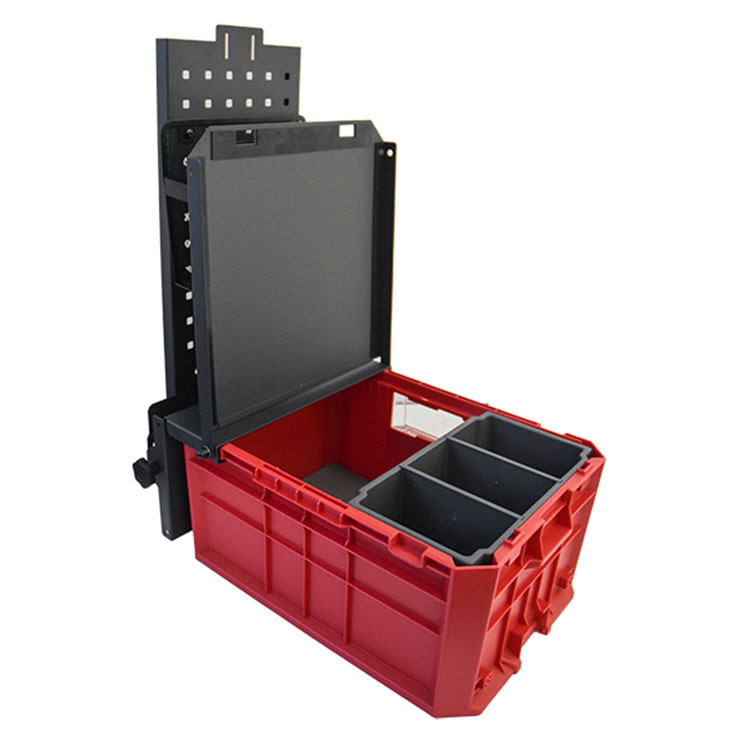 Das Mobile Office hat ein großes Fach zur Aufbewahrung und einen Deckel mit rutschfester Oberfläche. Im Lieferumfang sind eine Kunststoffauskleidung für die Basis, ein Einsatz für kleinere Geräte, ein Magnet zum Halten von Papieren und eine Aufbewahrungstasche enthalten.