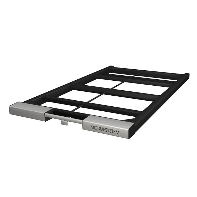 Leichte und robuste Auszugsvorrichtung aus ultrahochfestem Stahl mit einer Front aus eloxiertem Aluminium. Für noch flexiblere Verwendungsmöglichkeiten kann eine Ladeplatte auf der Vorrichtung montiert werden.
