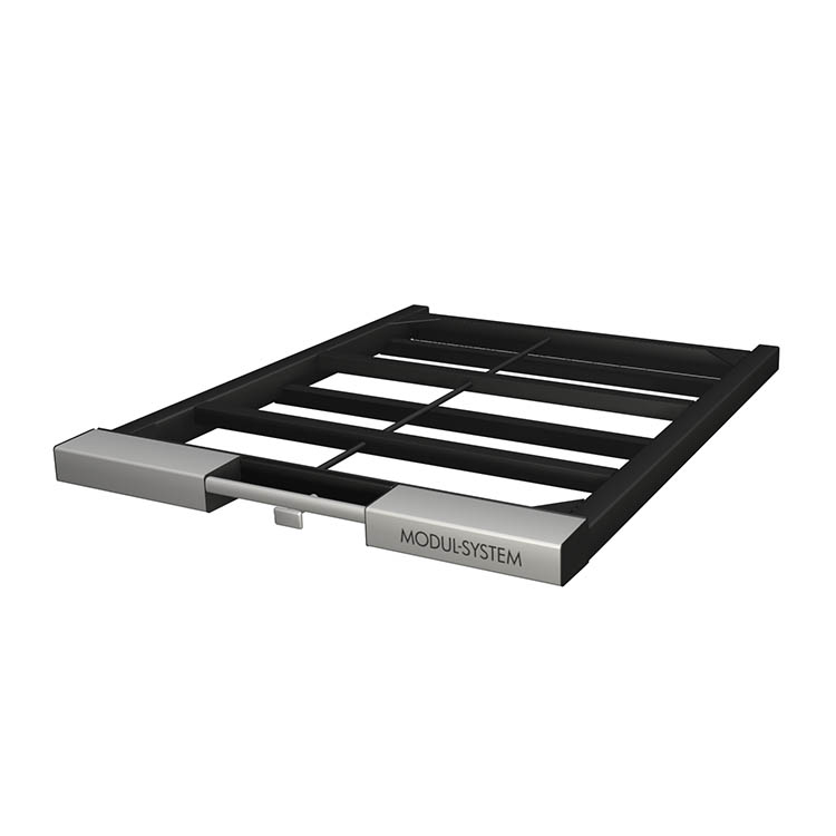 Leichte und robuste Auszugsvorrichtung aus ultrahochfestem Stahl mit einer Front aus eloxiertem Aluminium. Für noch flexiblere Verwendungsmöglichkeiten kann eine Ladeplatte auf der Vorrichtung montiert werden.