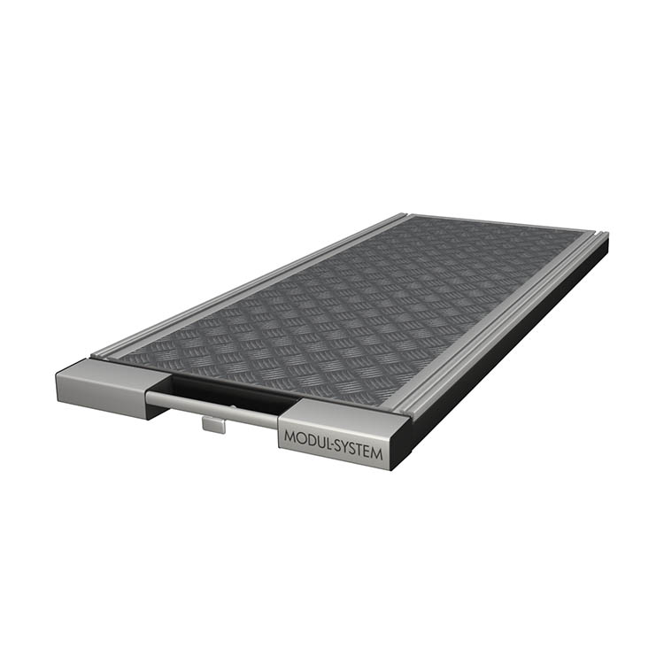Leichte und robuste Auszugsvorrichtung aus ultrahochfestem Stahl mit einer Front aus eloxiertem Aluminium und einer Ladeplatte aus leichtem Sandwichmaterial mit Aluminium-Oberseite.