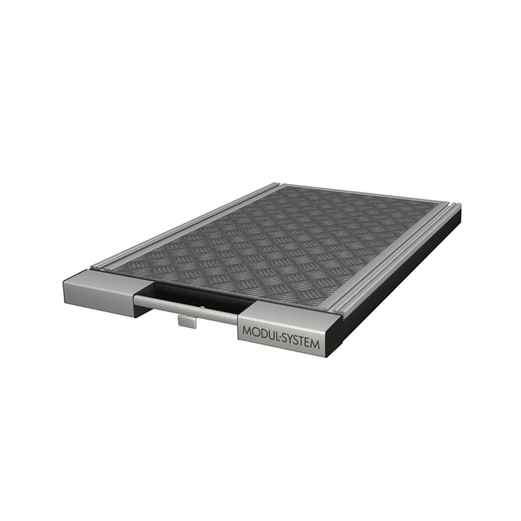 Leichte und robuste Auszugsvorrichtung aus ultrahochfestem Stahl mit einer Front aus eloxiertem Aluminium und einer Ladeplatte aus leichtem Sandwichmaterial mit Aluminium-Oberseite.