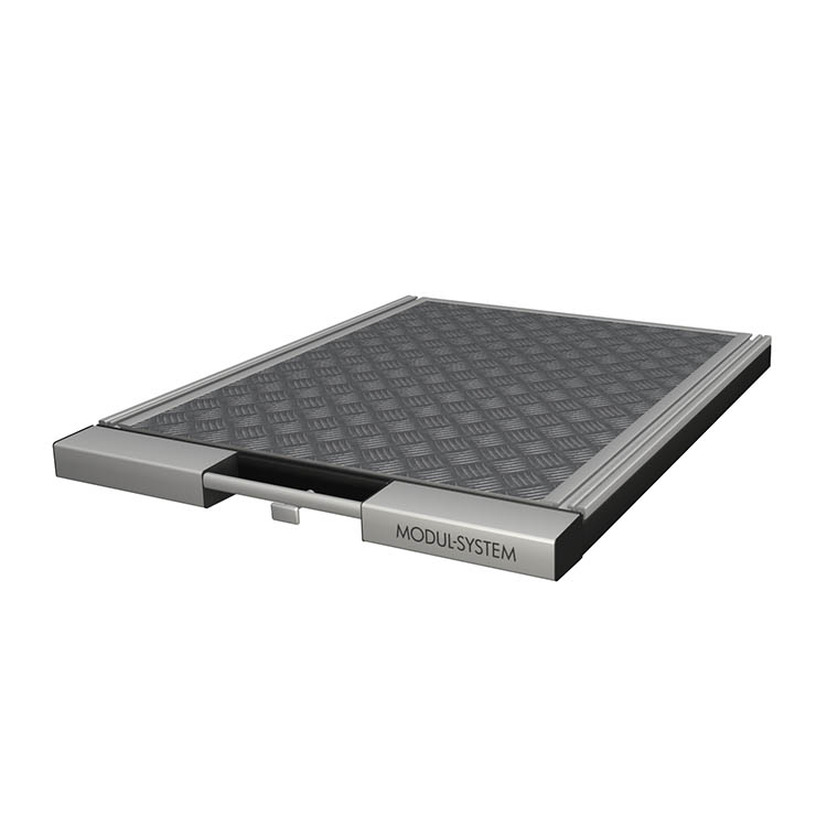 Leichte und robuste Auszugsvorrichtung aus ultrahochfestem Stahl mit einer Front aus eloxiertem Aluminium und einer Ladeplatte aus leichtem Sandwichmaterial mit Aluminium-Oberseite.