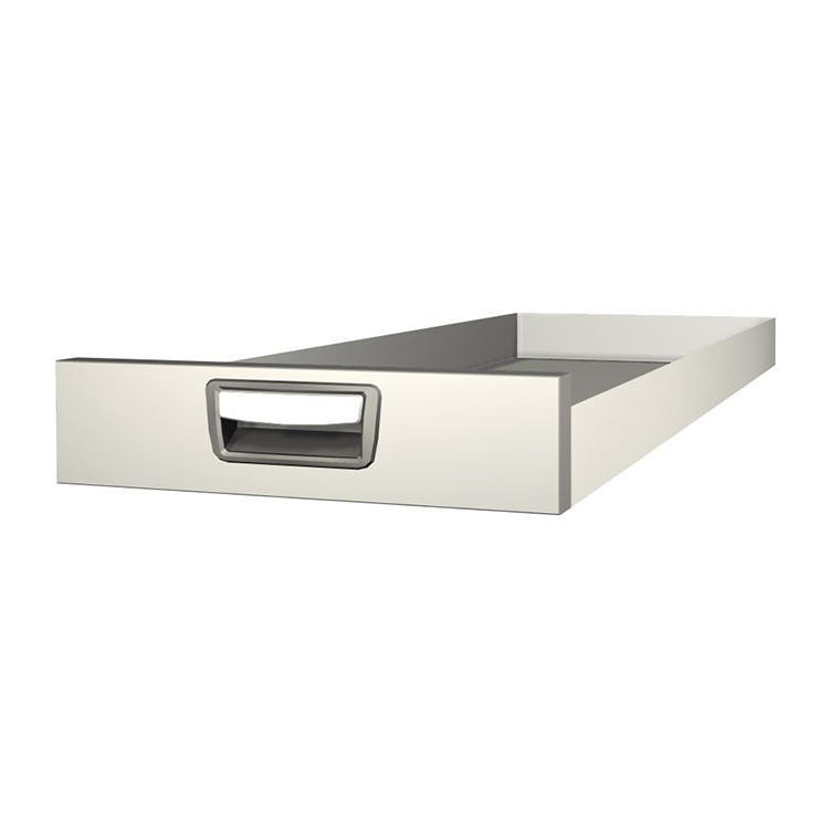 Robuste, extralange Schublade für den Einbau in einem Schubladenmodul. Die aus Aluminium gefertigte Schublade ist serienmäßig kugelgelagert. Die Mischung aus festen und flexiblen Lagern macht die Schublade stabil und einfach zu bedienen.