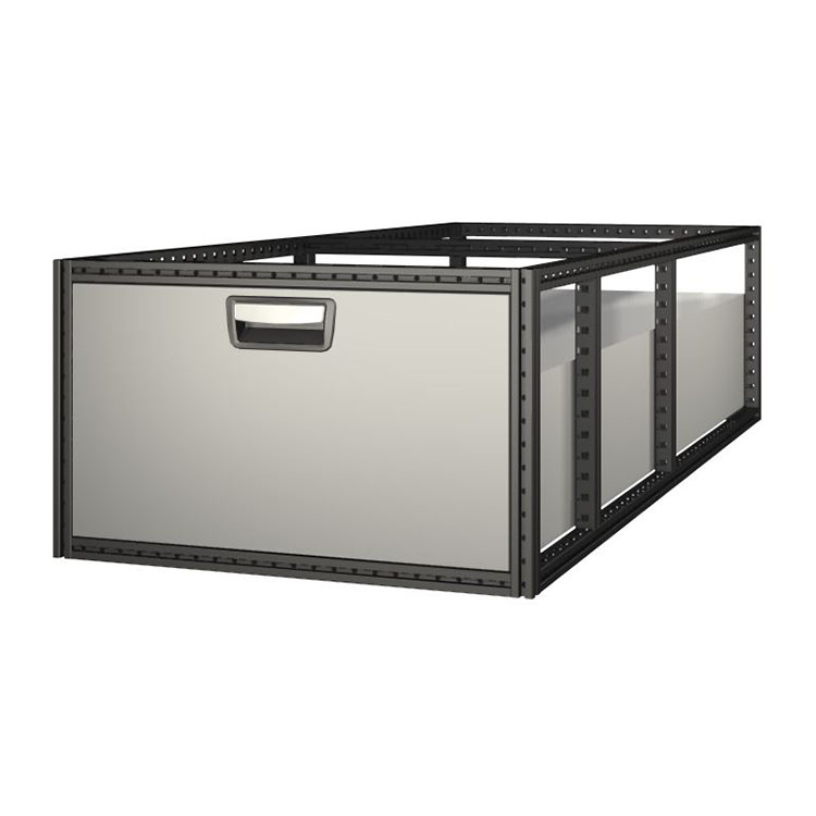 Die extralangen Schubladenmodule haben einen Rahmen aus ultrahochfestem Stahl und Schubladen aus Aluminium. Die Schubladen sind serienmäßig mit Kugellagern ausgestattet. Die Mischung aus festen und flexiblen Lagern macht sie sowohl stabil als auch einfach zu bedienen.