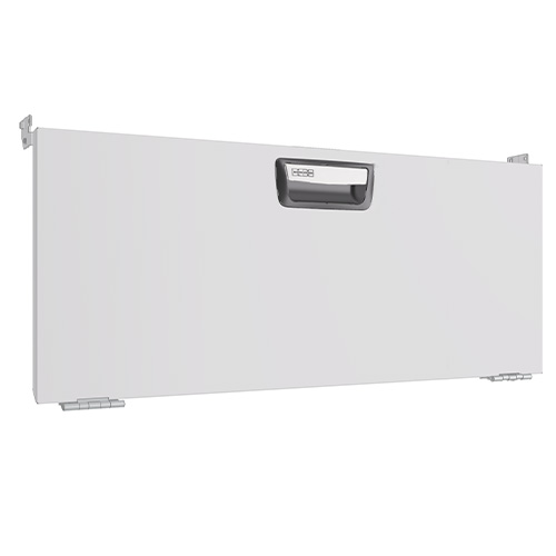 Herunterklappbare Klappen sind an beiden Seiten mit Gasfedern bestückt, die für ein sanftes Öffnen und Schließen sorgen. Der Öffnungswinkel beträgt 90°. Im Klappengriff ist eine Sperre integriert, die ein selbsttätiges Öffnen der Klappe während der Fahrt verhindert. Passend auch für Radkastengestelle mit optionaler Werkbankplatte. Wenn Sie eine Klappe zwischen zwei Regalseitenteilen anbringen möchten, benötigen Sie dafür ein Montagegestell.