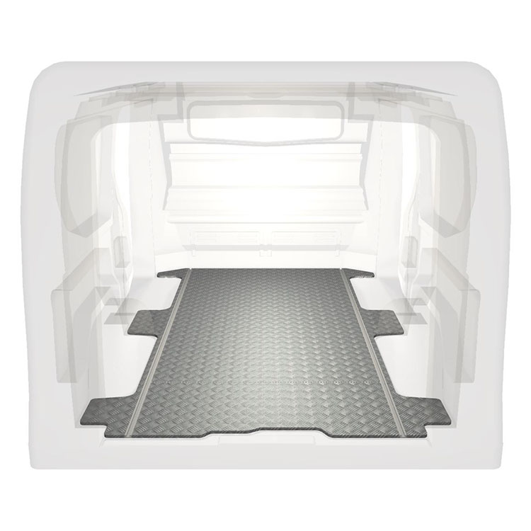 Leichte und robuste Standard-Fahrzeugböden für einen Renault Trafic / Opel Vivaro / Fiat Talento / Nissan NV300 werden mit einem rutschfesten Trittblech aus Aluminium und Schienen (längs) für eine schnelle und sichere Montage von Regalsystemen und anderem Zubehör geliefert.
