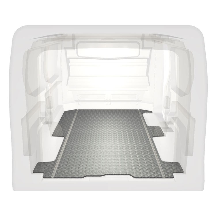 Leichte und robuste Standard-Fahrzeugböden für einen Renault Trafic / Opel Vivaro / Fiat Talento / Nissan NV300 werden mit einem rutschfesten Trittblech aus Aluminium und Schienen (längs) für eine schnelle und sichere Montage von Regalsystemen und anderem Zubehör geliefert.