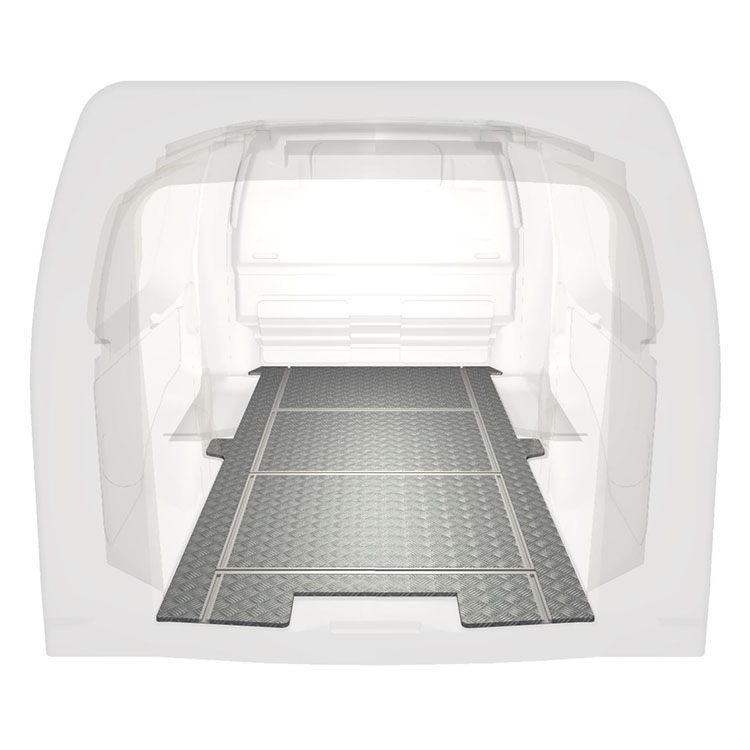 Leichte und robuste Fahrzeugböden mit Querschienen für einen Citroën Jumpy / Peugeot Expert / Toyota ProAce werden mit einem rutschfesten Trittblech aus Aluminium und Schienen (längs und quer) für eine schnelle und sichere Montage von Regalsystemen und anderem Zubehör geliefert.