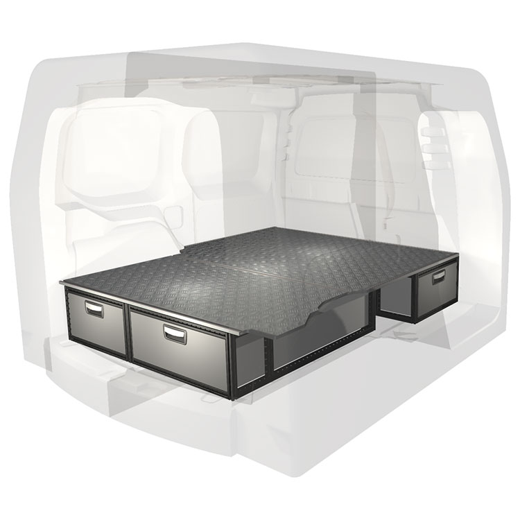 The kit is designed to be fitted on top of a wooden floor. The double floor is equipped with rails for easy installation of vehicle racking, and edging strips for a nice finish.