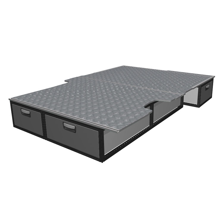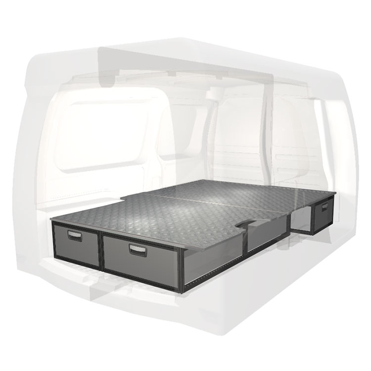 The kit is designed to be fitted on top of a wooden floor. The double floor is equipped with rails for easy installation of vehicle racking, and edging strips for a nice finish.