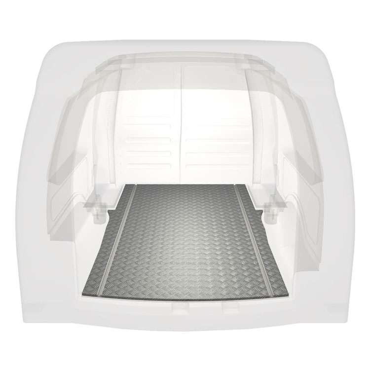 Leichte und robuste, extra lange Böden für einen Volkswagen Caddy Maxi werden mit einem rutschfesten Trittblech aus Aluminium und Schienen (längs) für eine schnelle und sichere Montage von Regalsystemen und anderem Zubehör geliefert.