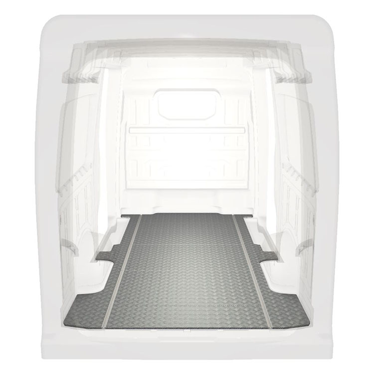 Leichte und robuste Standard-Fahrzeugböden für einen Volkswagen Crafter / MAN TGE werden mit einem rutschfesten Trittblech aus Aluminium und Schienen (längs) für eine schnelle und sichere Montage von Regalsystemen und anderem Zubehör geliefert.