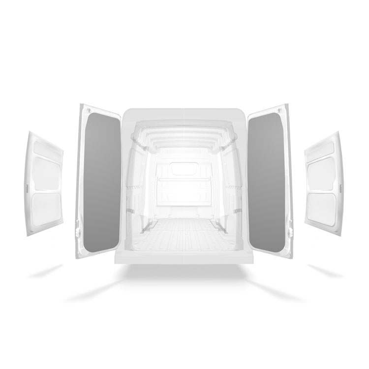 Leichte Vollverkleidung für die Hecktür eines Volkswagen Crafter / MAN TGE mit Doppeltüren. Die Türverkleidung erweckt einen professionellen Eindruck, schützt Ihr Fahrzeug und ist leicht zu reinigen.