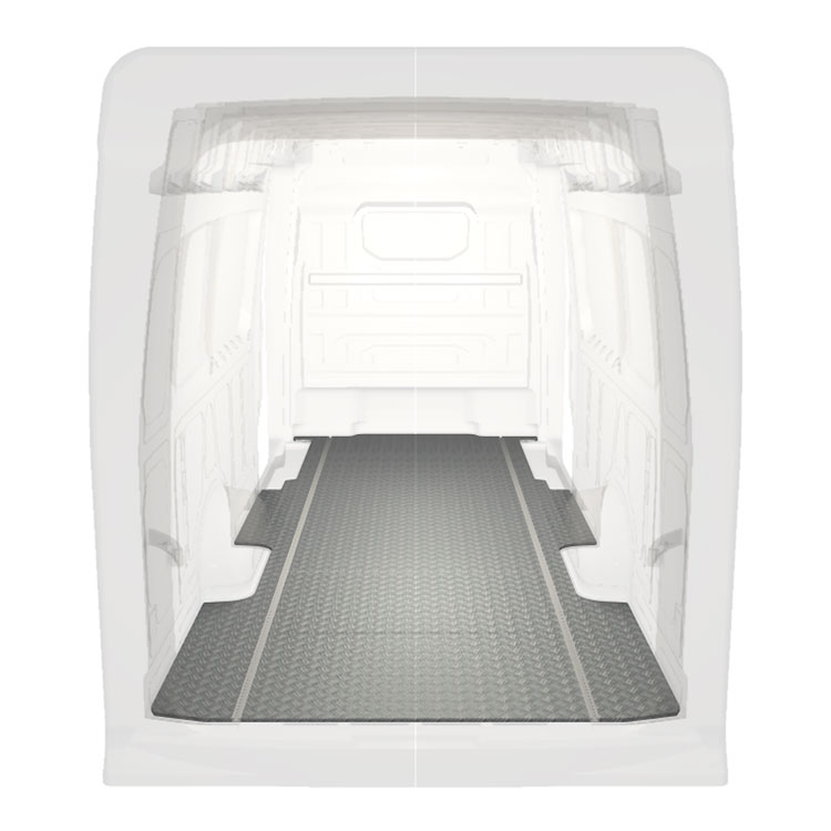 Leichte und robuste Standard-Fahrzeugböden für einen Volkswagen Crafter / MAN TGE werden mit einem rutschfesten Trittblech aus Aluminium und Schienen (längs) für eine schnelle und sichere Montage von Regalsystemen und anderem Zubehör geliefert.