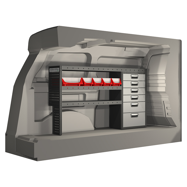 The racking has been specially designed to ensure the optimum fit to the vehicle, as well as the best possible functionality and safety. It has been developed for professional use, is flexible and is intended for service jobs in various types of business. All shelves are equipped with rubber mats, and all drawers with foam plastic liners. Assembly material is included.