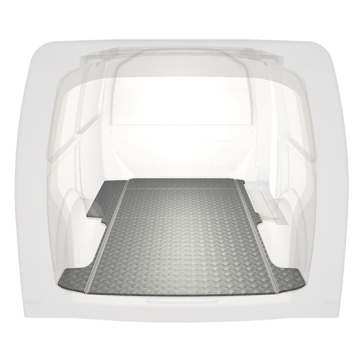 Leichte und robuste Standard-Fahrzeugböden für einen Volkswagen Transporter T6 werden mit einem rutschfesten Trittblech aus Aluminium und Schienen (längs) für eine schnelle und sichere Montage von Regalsystemen und anderem Zubehör geliefert.
