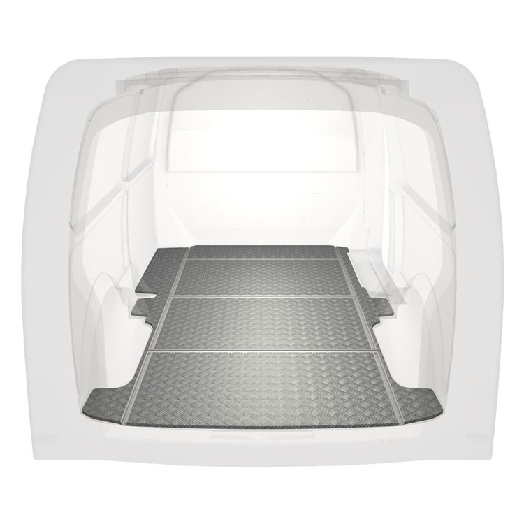 Leichte und robuste Fahrzeugböden mit Querschienen für einen Volkswagen Transporter T6 werden mit einem rutschfesten Trittblech aus Aluminium und Schienen (längs und quer) für eine schnelle und sichere Montage von Regalsystemen und anderem Zubehör geliefert.